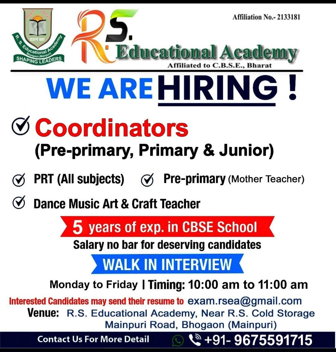 Required- PGT- All Subjects (Commerce, Arts, Medical, Non-Medical), Librarian, Art & Craft, Physical Education, Lab Assistant, SPL Educator, Warden M/F, Nurse, Accountant, Civil Engineer (Only Residential