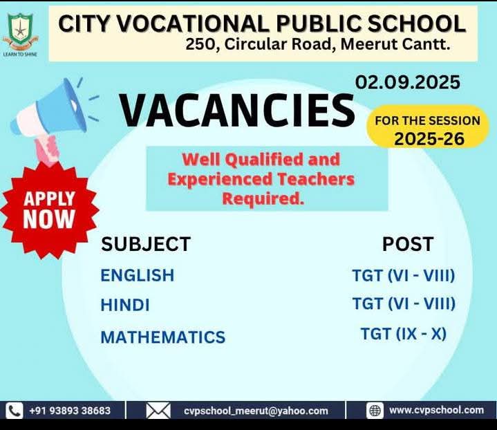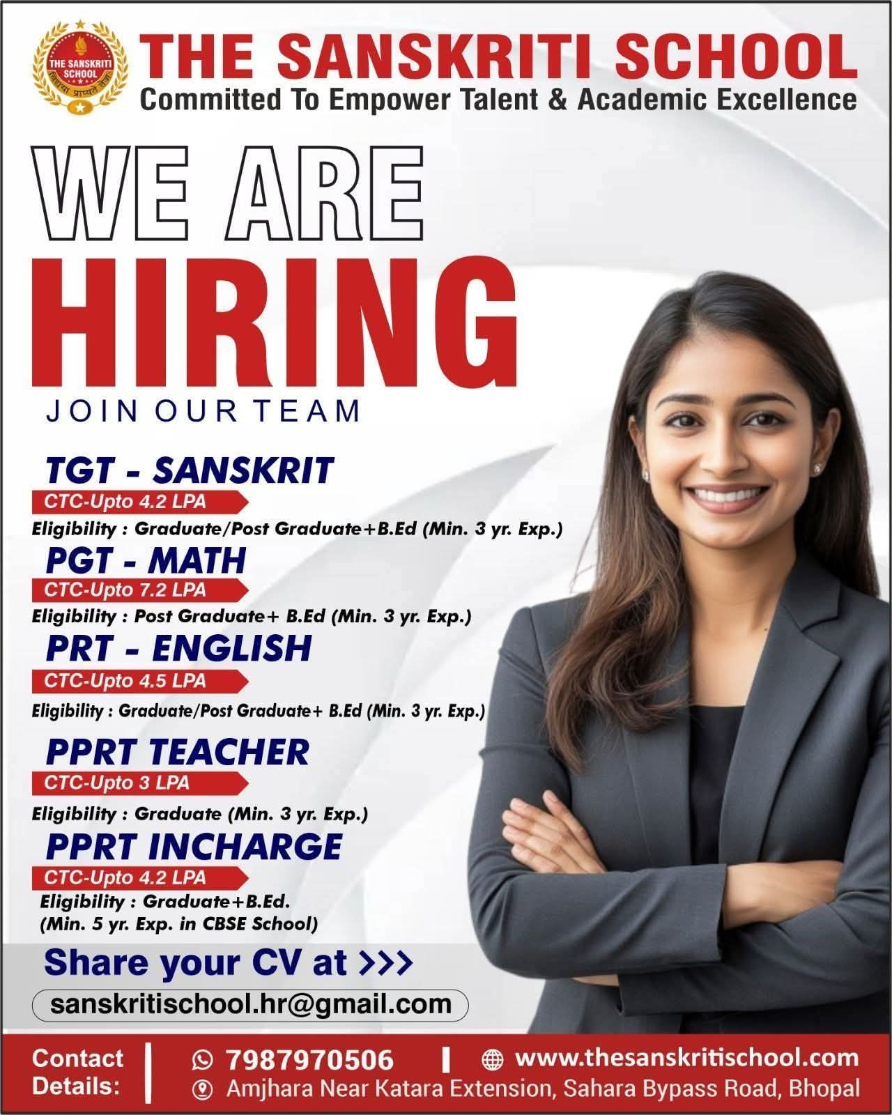 Required- TGT- Science, TGT- Computer Science, TGT- Hindi, PRT- English, Science