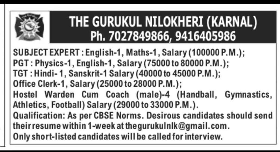 Staff required in Karnal, haryana